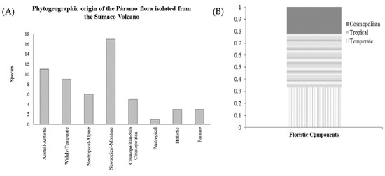 Geographical Distribution of Vascular Flora of Sumaco Paramo. (A) Species versus phytogeographic origin of the Paramo flora isolated from the Sumaco volcano; (B) Floristic components in relative distribution.