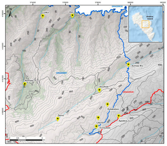 Alluvial forests with Alnus glutinosa Gaertn. and Fraxinus excelsior L. (priority habitat 91E0*; Annex I, Directive 92/43/EEC) are distributed throughout Europe, but they are generally rare and threatened since only remnants exist, mainly in central and northern Europe [1]. Alder stands are considerably less frequent in the Mediterranean region, where the repercussions of changes in the hydrological cycle caused by global warming and climate destabilization are much more evident [2]. The southernmost limit of the priority habitat 91E0* in the Balkan Peninsula is located in Andros island (Figure 1), i.e., the northernmost in the Cyclades and situated at a transition zone between continental Greece and other islands of the Aegean Archipelago. From the geomorphological point of view, it is characterized by a remarkably intense relief and by many rivulets and streams of constant flow, which are unique among most of Central and South Aegean islands. A. glutinosa trees demonstrate a patchy distribution in Andros, predominantly occurring along the main streams within the Site of Community Importance (SCI) GR4220001 and in altitudes ranging from sea level to as high as 850 m above sea level (a.s.l.), very close to the highest peaks of the island. In many cases black alders are mixed with Platanus orientalis L., Fraxinus ornus L. and/or Nerium oleander L. (in lower altitudes), while they also form pure stands, as it is the case at the estuaries of the Vori stream in NE Andros.