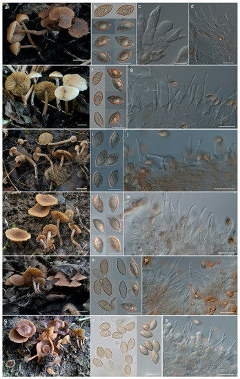 Species of the genus Alnicola recorded in Andros alder stands: A. escharoides basidiomes, basidiospores and cheilocystidia (a–c); A. umbrina basidiomes, basidiospores and cheilocystidia (d–f); A. striatula basidiomes, basidiospores and cheilocystidia (g–i); A. subconspersa basidiomes, basidiospores and cheilocystidia (j–l); A. luteolofibrillosa basidiomes, basidiospores and cheilocystidia (m–o); A. inculta basidiomes, basidiospores, basidia and cheilocystidia (p–s). Bars: basidiomes, 1 mm; basidiospores and basidia, 10 μm; cheilocystidia, 20 μm.