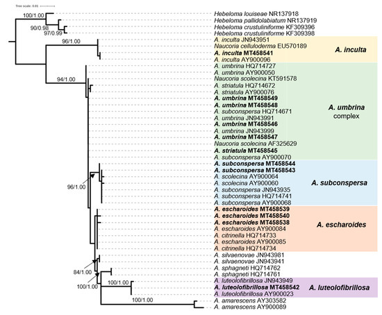 On the other hand, A. umbrina (Figure 3d–f) is hereby considered as a species complex following the nomenclatural concept of Moreau [45] and the outcome of the phylogenetic study by Rochet et al. [19]. According to our observations, A. umbrina shows a rather large morphological variability with dark brown hygrophanous pilei bearing prominent striations up to their centre when wet, becoming much lighter and indistinctly striate only at margin when dry. Basidiospores are variable in size and shape, often somewhat elongated fusiform, weakly to moderately verrucose, measuring 10.7–13.6 × 5.2–6.1 μm, Q = 1.9–2.4. Sequences generated in this work clustered together with material identified as A. umbrina, N. scolecina (Fr.) Quél., A. striatula (P.D. Orton) Romagn. and A. subconspersa (Kühner ex P.D. Orton) Bon into a group that was not adequately supported (Figure 4). However, the morphological features of specimens identified as N. scolecina in Europe are very similar to descriptions of A. umbrina [22,33,48,49]. Therefore, N. scolecina and A. umbrina form part of the same complex and the question whether they constitute different entities or not remains open and in need of further research.