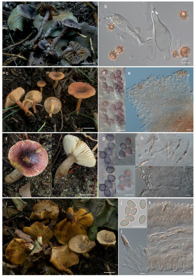 Alder-associated ECM fungi recorded in Andros: Paxillus olivellus basidiomes (a; bar 1 mm), basidiospores (b; bar 10 μm), section of lamella (c; bar 20 μm), hymenial cystidium and basidia (d; bar 20 μm); Lactarius obscuratus basidiomes (e, bar 1 mm), basidiospores (f, bar 10 μm), pileipellis (g, bar 20 μm); Russula pumila basidiomes (h, bar 1 mm), basidiospores (i, bar 10 μm), pileipellis (j, bar 20 μm); Cortinarius americanus basidiomes (k, bar 1 mm); Inocybe calospora basidiospores, basidium and pleurocystidium (l, bar 10 μm).