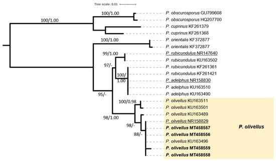Phylogeny of Paxillus species derived from rDNA ITS sequences through ML analysis. Branches are labelled when MLB > 65%, and BPP > 0.95. P. cuprinus and P. obscurosporus were used as outgroups. The coloured box includes sequences from specimens recorded in the Alnus glutinosa habitat.