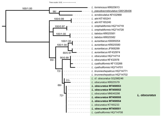 A total of 42, 29 and 22 ITS sequences corresponding to selected species of the genera Alnicola Kühner (and Naucoria (Fr.) P. Kumm.), Lactarius Pers. and Paxillus Fr. (including 12, 5 and 4 sequences generated in this work), respectively, were subjected to phylogenetic analysis. In addition, species of the same or other genera were used as outgroups in each case. Multiple sequence alignment of each ITS rDNA dataset was conducted using the Q-INS-I algorithm as implemented in the online version of MAFFT v. 7 [39]. Alignments were reviewed, manually adjusted at misaligned sites and trimmed at the same position through MEGA X [40] before being used for further analysis.