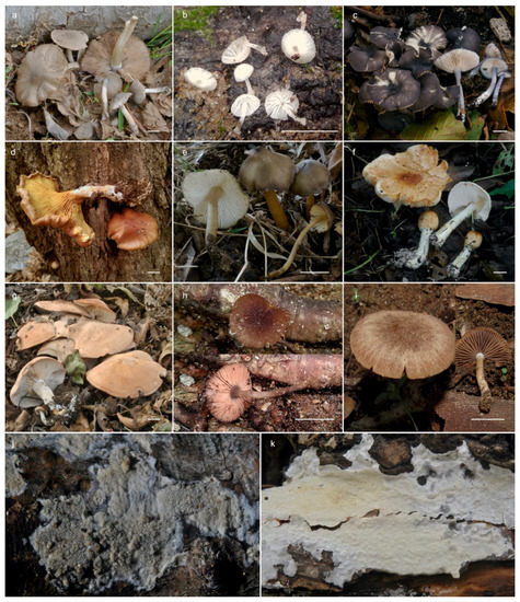 Saproxylic species recorded on Alnus glutinosa wood and litter in Andros: Hyphodermella corrugata (a) Phanerochaete livescens (b) Pluteus podospileus (c) Delicatula integrella (d) Coprinopsis melanthina (e) Gymnopilus arenophilus (f) Hydropus floccipes (g) Lepiota ochraceofulva (h) Lepista ovispora (i) Psathyrella hellebosensis (j) Entoloma uranochroum (k) Bar: 1 mm.