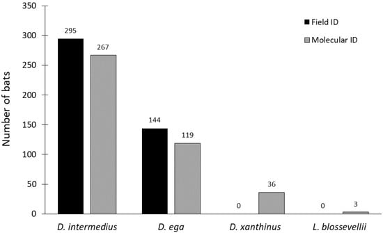 Survey efforts in the field assigned sex to just 35% (n = 153) of the total carcasses, of which 94% had a correct sex assignment that was confirmed using molecular methods (Figure 3). Of carcasses identified as either male or female based on external morphology, there was no significant deviation from a 50:50 male:female sex ratio (Fisher’s exact test: p = 0.87). Using molecular methods, 94% (n = 411) of the DNA samples amplified at the sex chromosome introns. With all species pooled together, 56% of bats were female (n = 230), with a significant deviation from a 50:50 sex ratio (Fisher’s exact test: p = 0.016; Figure 3) when using molecular sex determination. All three L. blossevillii bats were female. Of the 112 D. ega with successful sex chromosome intron amplification, 62% (n = 69) were female, representing a significant deviation from a 50:50 sex ratio (Fisher’s exact test: p = 0.018; Figure 4). Of the 254 D. intermedius with successful sex chromosome intron amplification, 53% (n = 134) were female, which was not significantly different from a 50:50 sex ratio (Fisher’s exact test: p = 0.415; Figure 4). Of the 34 D. xanthinus with successful sex chromosome intron amplification, 62% (n = 21) were female, which was also not significantly different from a 50:50 sex ratio (Fisher’s exact test: p = 0.229; Figure 4).