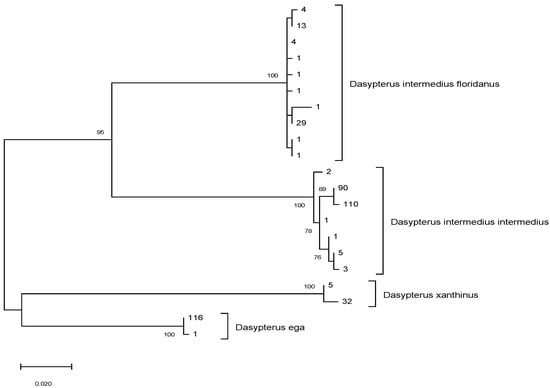 Of the 439 tissue samples collected during surveys, 83% of carcasses (n = 366) were correctly identified to species based on DNA barcoding analysis (Figure 1). DNA barcoding improved the overall proportion of carcasses with accurate species identification to 97% (n = 425; Figure 1). Correct species identification in the field was independent of time since death, suggesting that decomposition and scavenging did not interfere with species identification (χ2 = 1.45, df = 2, p = 0.484). DNA barcoding revealed the presence of two additional species in the dataset: D. xanthinus (n = 36) and Lasiurus blossevillii (n = 3). Of the 295 carcasses that were field-identified as D. intermedius, 88% (n = 261) were correctly identified as D. intermedius, whereas 5% were D. ega (n = 14), and 4% were D. xanthinus (n = 11). Of the 144 carcasses that were field-identified as D. ega, 73% (n = 105) were correctly identified as D. ega, whereas 17% were D. xanthinus (n = 25), 4% were D. intermedius (n = 6), and 2% were D. blossevillii (n = 3; Figure 1). Due to DNA degradation, we were unable to obtain DNA barcodes for 3% (n = 9) of field-identified D. intermedius and 4% (n = 5) of field-identified D. ega. The maximum-likelihood tree using the 20 unique haplotypes we found in this study and from Korstian et al. [17], has clades corresponding to each of the three Dasypterus species (Figure 2). Bootstrap values separating species are in excess of 95. D. intermedius was split into two well supported monophyletic clades that corresponded to each putative subspecies, D. i. floridanus and D. i. intermedius.