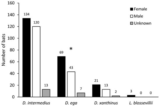 Number of individual bats from each species identified as female, male, or sex unknown using molecular methods. The star above D. ega indicates a significant deviation from a 50:50 sex ratio (Fisher’s exact test: p = 0.018).