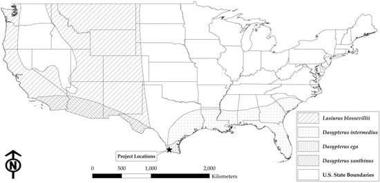 - Decker, S.K.; Krejsa, D.M.; Lindsey, L.L.; Amoateng, R.P.; Ammerman, L.K. Updated distributions of three species of yellow bat (Dasypterus) in Texas based on specimen records. W Wildl. 2020, 7, 2–8. [Google Scholar]