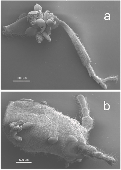 - Bajerlein, D.; Witaliński, W.; Adamski, Z. Morphological diversity of pedicels in phoretic deutonymphs of Uropodina mites (Acari: Mesostigmata). Arthropod Struct. Dev. 2013, 42, 185–196. [Google Scholar] [CrossRef] [PubMed]