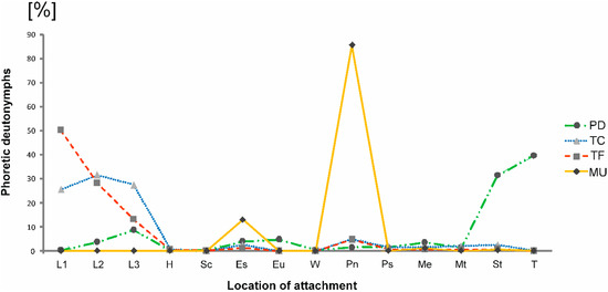 - Konwerski, S.; Gutowski, J.M.; Książkiewicz-Parulska, Z.; Błoszyk, J. Repeatability of the phoretic relationships between mites of the genus Trichouropoda Berlese (Parasitiformes: Uropodina) and longhorn beetles of the genus Tetropium Kirby (Coleoptera: Cerambycidae) in Białowieża Primeval Forest, Central Europe. Int. J. Acarol. 2017, 43, 612–621. [Google Scholar] [CrossRef]