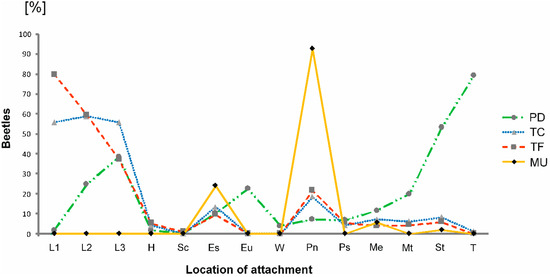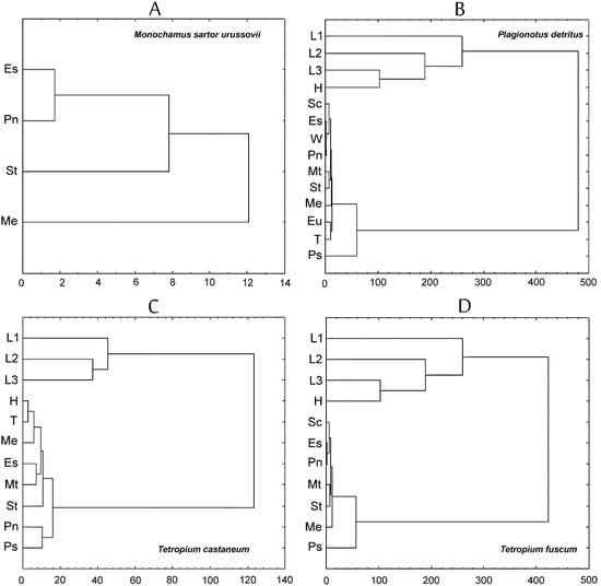 | Beetle Species | L1 | L2 | L3 | H | Sc | Es | Eu | W | Pn | Ps | Me | Mt | St | T |