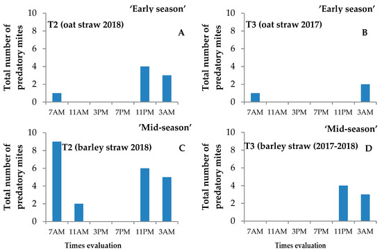 Total mites (except Tetranychus urticae) collected in the second and fourth evaluations at 3, 7, 11 a.m. and 3, 7, 11 p.m. on the six marked leaflets with T. urticae/plant (n = 13 plants/treatment) in two lab experiments for different periods of time: ‘Early season’ experiment (oat straw: T2, since 2018; T3, since 2017); ‘Mid-season’ experiment (barley straw: T2, since 2018; T3, lower half layer since 2017 and top half layer since 2018). Light was on from 6 a.m. to 9 p.m.