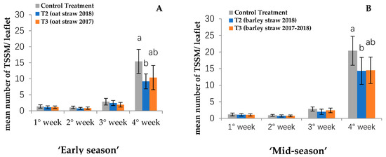 Weekly mean number of Tetranychus urticae observed on six marked leaflets per plant (n = 13 plants per treatment). (A): ‘Early season’ experiment (T2, oat straw since 2018; T3, oat straw since 2017); (B): ‘Mid-season’ experiment (T2, barley straw since 2018; T3, barley straw lower half layer since 2017 and top half layer since 2018. Light was on from 6 a.m. to 9 p.m.