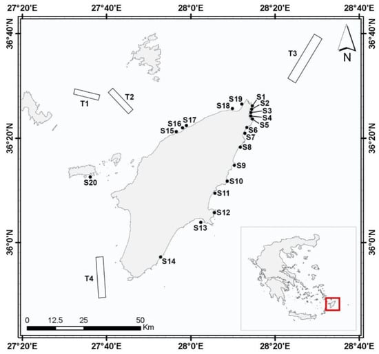 Study area with the location of Rhodes Island within Greece (red square). Sampling sites (S1–S20) and trawling grounds (T1–T4) as reported in Table 1.