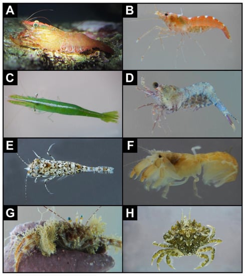 Figure 2. Decapods from Rhodes area, in colours. (A) Brachycarpus biunguiculatus, not measured; (B) Athanas nitescens, CL 3.3 mm; (C) Hippolyte inermis, CL 2.6 mm; (D) Eualus cranchii, CL 2.1 mm; (E) Philocheras trispinosus, CL 4.0 mm; (F) Upogebia deltaura, CL 5.0 mm; (G) Pagurus cuanensis, SL 4.2 mm; (H) Pirimela denticulata, CL 13.3 mm.- Brachycarpus biunguiculatus—Zariquiey Álvarez []: 161, figures 64b and 69a.