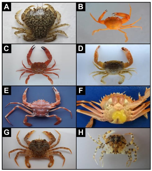 - Poupin, J.; Davie, P.J.F.; Cexus, J.C. A revision of the genus Pachygrapsus Randall, 1840 (Crustacea: Decapoda: Brachyura, Grapsidae), with special reference to the Southwest Pacific species. Zootaxa 2005, 1015, 1–66. [Google Scholar] [CrossRef]