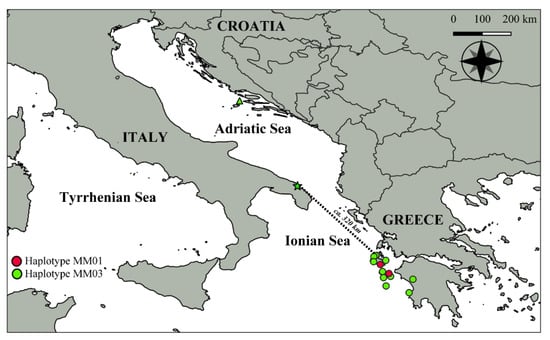 Map of the Adriatic-Ionian region showing the haplotype distribution of the Mediterranean monk seals previously analyzed. Only data with correct geographic locations are shown. The circle indicates data from Karamanlidis et al. [], the triangle indicates data from Gaubert et al. [], and the star indicates the location where our sample was found.