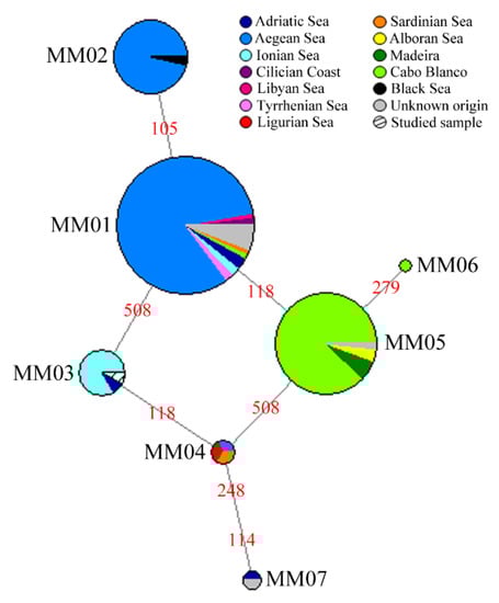 The Mediterranean monk seal was a female weighing 22.5 kg and 118 cm long. Pelage color, weight and standard length suggest that it was a pup of about 2–4 months of age. Genetic analysis of the individual allowed us to successfully amplify and sequence a 524 bp fragment of the HVR1 of the mtDNA control region. The sequence obtained was stored in the GenBank repository with the Accession number MT524708. After the alignment of this sequence with those of the seven M. monachus haplotypes known so far, six diagnostic sites were identified, allowing the assignment of the pup sequence to the haplotype MM03 (Table 1). The map and the haplotype network, which include information about geographical origin of the known haplotypes, showed that the haplotype MM03 has been previously observed only in Greek populations inhabiting the Ionian Sea and in a sample from the Adriatic Sea (Figure 2 and Figure 3).