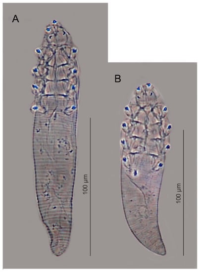 Demodecid mites were isolated using skin digestion methods []. Skin fragments of 1 cm2 were collected from several body regions, including the head (around eyes, ear pinnae, nose, lips, chin, cheeks and vertex), neck, abdomen, back, limbs, tail and genital-anal area. Skin samples were preserved in 70% ethanol and digested in 10% potassium hydroxine solution. The obtained samples were decanted and analyzed using phase-contrast microscopy; an examination of 1 cm2 of skin was equal to the analysis of approximately 100 wet preparations. The mites were mounted in polyvinyl-lactophenol solution and photographed. The following measurements (µm) were taken as follows: Total body length equals length of gnathosoma, podosoma and opisthosoma; gnathosomal width equals width at base; and podosomal and opisthosomal width equals maximum width. The specimens were deposited in scientific collections within the framework of the Collection of Extant Invertebrates in Department of Invertebrate Zoology and Parasitology, University of Gdańsk, Gdańsk, Poland (UGDIZP).