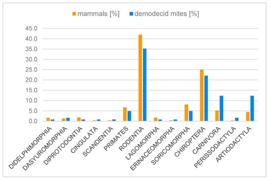 Share (%) of species from particular orders within mammals in comparison with the participation (%) of related demodecid mites.