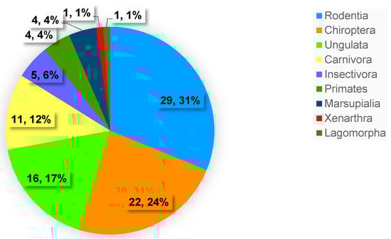 Mammals—hosts of Demodecidae (species number and % of mammals from different orders).