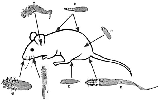 Topographic preferences of demodecid mites in house mouse: (A) Demodex conicus. (B) Demodex musculi. (C) Demodex marculus. (D). Demodex flagellurus. (E) Demodex fusiformis. (F) Demodex vibrissae. (G) Glossicodex musculi.