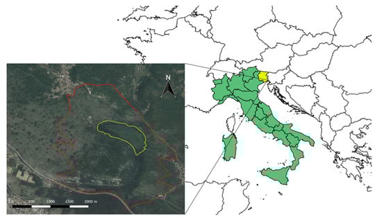 Location of the study area (yellow border) within the Regional Natural Reserve “Laghi di Doberdò e Pietrarossa” protected area (red dashed border).