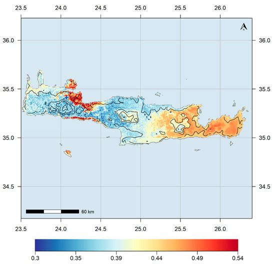 The eastern, central and high-altitude parts of Crete are more likely to lose most of the SIE occurring there (Figure 2 and Figure S1). The SIE hotspots are currently located above 1500 m a.s.l. in Crete (Figure 2), but all of them are expected to shift downwards—even below 1000 m a.s.l. under any GCM/RCP (Figure 2 and Figure S1)—and these shifts are significantly different in absolute or relative terms (Figures S2 and S3).