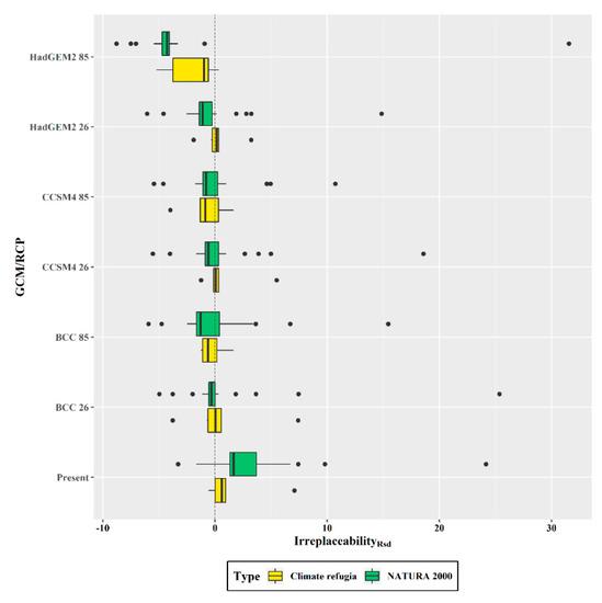Mean irreplaceability index standardised for area, for the protected area network (Natura 2000 sites) and climatic refugia in Crete, for the current and all the Global Circulation Model (GCM) and Representative Concentration Pathway (RCP) combinations considered in our study. The vertical dashed line represents the median irreplaceability index.