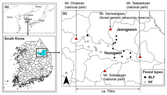 Figure 1. Map of (a) study area and (b) study sites (filled circle, broad-leaved deciduous forests (BLF); opened circle, Pinus densiflora forests (PF)).