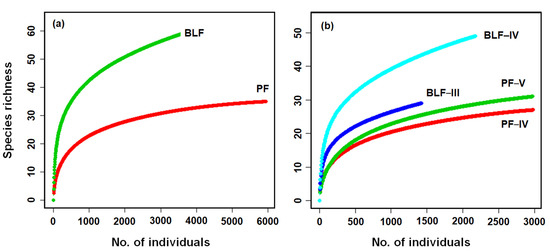 Figure 2. Individual-based rarefaction curves for ground-beetle catches (a) in Pinus densiflora forests (PF) and broad-leaved deciduous forests (BLF), and (b) in forest age classes (III, 21–30-years old; IV, 31–40-years old; V, 41–50-years old). Data points indicate average species numbers computed for the given number of individuals.
