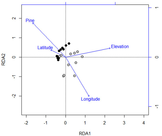 Figure 3. A RDA ordination of species composition of ground beetles in 22 sites. The first and second RDA axes are shown. The different forest types are shown as closed circles by different colors, i.e., black, broad-leaved deciduous forests and grey, Pinus densiflora forests.