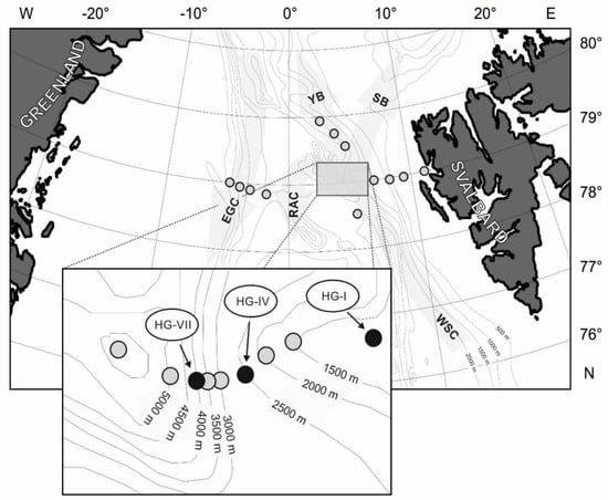 - Grzelak, K.; Kotwicki, L.; Hasemann, C.; Soltwedel, T. Bathymetric patterns in standing stock and diversity of deep-sea nematodes at the long-term ecological research observatory HAUSGARTEN (Fram Strait). J. Mar. Sys. 2017, 172, 160–177. [Google Scholar] [CrossRef]