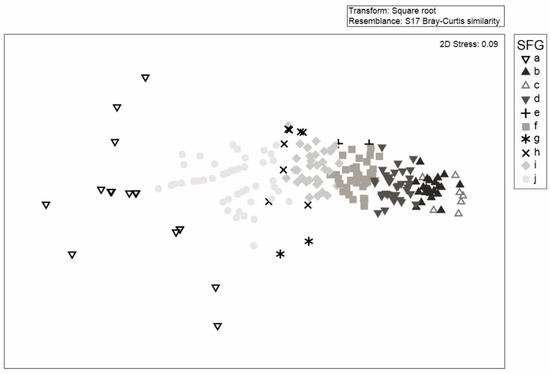 - Clarke, K.; Somerfield, P.; Gorley, R. Testing of null hypotheses in exploratory community analyses: Similarity profiles and biota-environment linkage. J. Exp. Mar. Biol. Ecol. 2008, 366, 56–69. [Google Scholar] [CrossRef]