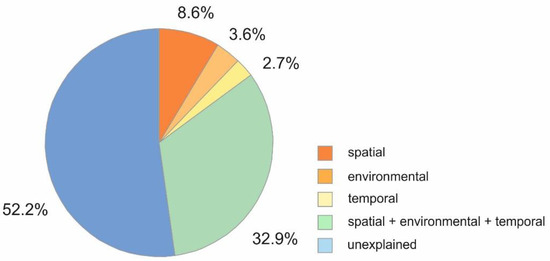 - Borcard, D.; Legendre, P.; Drapeau, P. Partialling out the spatial component of ecological variation. Ecology 1992, 73, 1045–1055. [Google Scholar] [CrossRef]