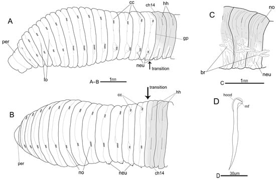 Dasybranchus geojedoensis sp. nov. (shadings indicate methyl green staining patterns (MGSP)). (A) Anterior end, left lateral view; (B) Same, dorsal view; (C) Abdominal chaetigers 64–66, left lateral view; (D) Abdominal hooded hook, lateral view. Br, branchiae; cc, capillary chaetae; ch, chaetiger; gp, genital pore; hh, hooded hooks; lo, lateral organ; mf, main fang; neu, neuropod; no, notopod; per, peristomium.