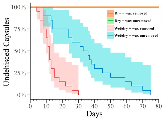 Repetitive wet and dry cycles served as the main environmental factor triggering capsule dehiscence. The experiment lasted 75 days, corresponding to the period in which all treated capsules dehisced (Figure 1). During the same period, none of the capsules subjected to constant dry condition dehisced, corroborating our previous observation that undehisced capsules remain closed for several years when stored dry (Figure 1). The shortest time that led to a dehisced capsule was 8 days, while the longest was 75 days. The median predicted by survival curves for dehiscence was 34.5 days. The progressive reduction of undehisced capsules (survival curves) resulted in a highly significant difference between treatment (χ2 = 23.4, df = 1, p < 0.0001). By focusing only on the treatments involving cycles of wet-dry conditions, dehiscence timing was lower in capsules where wax was removed than in capsules with wax retained (Figure 1). The time to reach the dehiscence of all capsules from which wax was removed ranged between 8 and 30 days, with a predicted median of 12 days. The lifetime analysis showed significant heterogeneity among treatments (Figure 1, Table 1). The regression coefficients in Table 1 and their estimated covariance showed that wax removal can effectively speed up the dehiscence process.