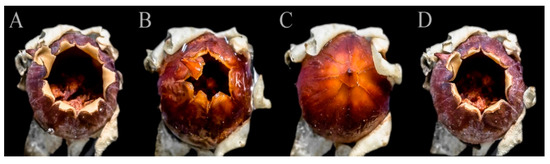 Hygroscopic movement of P. palinuri capsules: (A) dry capsule; (B) capsules wetted with sprinkling distilled water; (C) end of closing process, average duration 10 min; (D) reopening due to drying out, average duration 120 min.