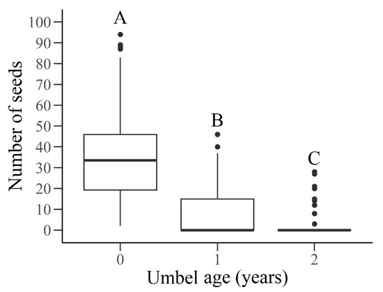 Seed storage on plants was tested by performing a one-way analysis of variance (ANOVA). To establish a normal distribution and homogeneity of data, a log-transformation was performed. These analyses were followed by Tukey’s HSD grouping tests, to identify heterogeneous groups. Statistics were calculated by using R version 3.5.2 [42].