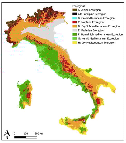 The Dry Submediterranean (D) is the widest ecoregion (Figure 3). Together with the Humid Submediterranean (F), it covers ca. 60% of the country. The other low altitude ecoregions—Padanian (E), Dry (G), and Humid Mediterranean (H)—together occupy ca. 12% of the country. The Montane ecoregion (C), occupying ca. 13% of the country, is the only one occurring in all administrative regions. The Alpine (A), Subalpine (A1), and Oromediterranean (B) ecoregions have a very small surface area (ca. 10% of the country altogether).