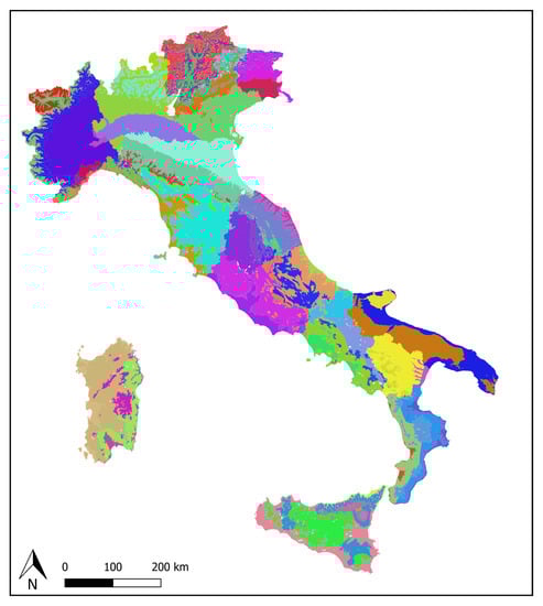 A GIS map was generated from the digital elevation model (DEM) of the country, obtained by the national geoportal (http://www.pcn.minambiente.it), with a resolution of 20 m. The original map was split into administrative regions, and inside each region the ecoregions were delimited by means of the r.reclass, r.to.vect, and v.patch of the software GRASS GIS 7.4 (https://grass.osgeo.org/), thus producing a GIS map of a total of 97 OGUs (Figure 2). Subsequently, the ecoregions present in each region were extracted from each of the 20 raster maps using the assigned ranges of elevation (Table 1) using the function GRASS GIS r.reclass. The ecoregions occurring each administrative region were transformed into vectors (r.to.vect of GRASS GIS) and joined into a single map of all Italy (v.patch of GRASS GIS). The subdivision between “humid” and “dry” ecoregions is based on Nimis and Tretiach [], in which the concept of “Thyrrenian Italy” and the influence of humid western winds to lichen communities were discussed. The “Padanian” ecoregion is a sub-Mediterranean portion of the country, including especially the whole Po plain, where high anthropization strongly affects lichen diversity []. Each of the 97 OGUs is made of a number of polygons ranging from 1 to n. Since computation complexity increases with the number of polygons, it was decided to take into account only the 20 larger polygons for each OGU. This allowed to drastically reduce computation complexity while retaining almost the whole surface of each OGU. In fact, discarding the smaller polygons led to the loss of 0.6% only of the total surface of the country. The number of ecoregions for each administrative region, together with their surface in percentage, are reported in Table 2.