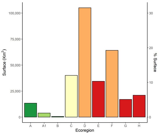 Surface (in km2, and in percentage of total surface area), of the 9 ecoregions: Alpine (A), Subalpine (A1), Oromediterranean (B), Montane (C), Dry Submediterranean (D), Padanian (E), Humid Submediterranean (F), Humid Mediterranean (G), Dry Mediterranean (H). Similar colors of the bars depict ecoregions occupying the same altitudinal range. Color codes are green (high-altitude ecoregions), yellow (Montane ecoregion), orange (Submediterranean ecoregions), and red (Mediterranean ecoregions).