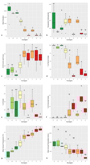 Box-plot graphs depicting average altitude (m) (a), topographic diversity (b), landscape heterogeneity (c), percentage of natural and semi-natural habitats (d), percentage of woodland surface (e), percentage of anthropized surface (f), average mean temperature (g), average precipitation (h) for the OGUs of the 9 ecoregions: Alpine (A), Subalpine (A1), Oromediterranean (B), Montane (C), Dry Submediterranean (D), Padanian (E), Humid Submediterranean (F), Humid Mediterranean (G), Dry Mediterranean (H). Significant differences are labeled by different letters (Wilcoxon test). Box colors show ecoregions with the same altitudinal range. Color codes are green (high-altitude ecoregions), yellow (Montane ecoregion), orange (Submediterranean ecoregions), and red (Mediterranean ecoregions).