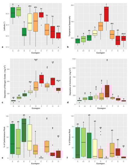 Box-plot graphs depicting average latitude (a), average temperature seasonality (b), average deposition of nitrogen oxides (NOX) (mg/m2) (c), average deposition of ammonia (NH4, NH4+) (mg/m2) (d), percentage of carbonatic substrata (e), and percentage of siliceous substrata (f) for the OGUs of the 9 ecoregions: Alpine (A), Subalpine (A1), Oromediterranean (B), Montane (C), Dry Submediterranean (D), Padanian (E), Humid Submediterranean (F), Humid Mediterranean (G), Dry Mediterranean (H). Significant differences are labeled by different letters (Wilcoxon test). Box colors show ecoregions with the same altitudinal range. Color codes are green (high-altitude ecoregions), yellow (Montane ecoregion), orange (Submediterranean ecoregions), and red (Mediterranean ecoregions).