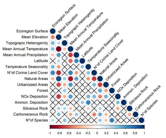 Species richness is also associated with topographic heterogeneity, likely due to its effect on micro- and meso-climatic conditions. This is particularly evident in the high species richness of the Alpine, Subalpine, and Oromediterranean ecoregions, even if they account for a very small surface (ca 6.5%). This pattern is consistent with the outstanding richness of the lichen biota of the Alps []. However, besides environmental factors, this situation may also reflect an exploration bias, since high-elevation areas have a long-lasting tradition of lichenological surveys.
