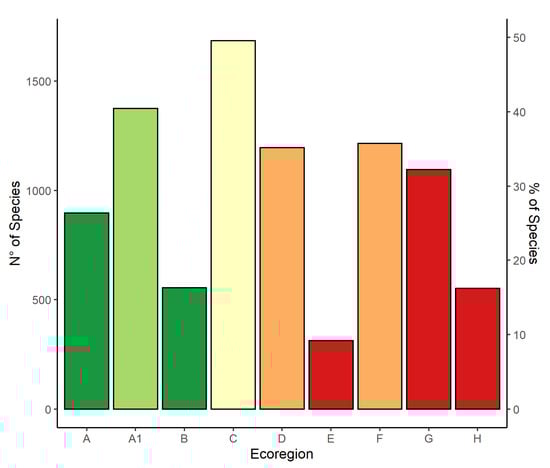 Bar-plot graph depicting the abundance of taxa occurring in each of the 9 ecoregions: Alpine (A), Subalpine (A1), Oromediterranean (B), Montane (C), Dry Submediterranean (D), Padanian (E), Humid Submediterranean (F), Humid Mediterranean (G), Dry Mediterranean (H). Similar colors of the bars depict ecoregions occupying the same altitudinal range. Color codes are green (high-altitude ecoregions), yellow (Montane ecoregion), orange (Submediterranean ecoregions), and red (Mediterranean ecoregions).