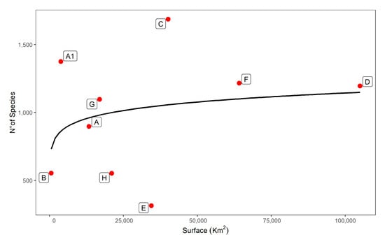 Where S is the number of taxa, A the area, and c and z two fitted parameters. The former represents the number of taxa expected per area unit, the latter is the angular coefficient of the straight line in a log-log space. The model was produced using the function “SSArrhenius” from the vegan package [], The graph was produced by means of the ggplot2 package []. All analyses were conducted in R version 4.0.2 [].