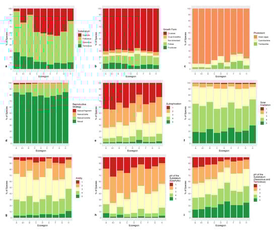 Bar-plot graphs depicting the distribution of lichen taxa per substratum (a), growth form (b), photobiont (c), reproductive strategy (d), along with the values of the indicator of eutrophication (from 1—no eutrophication, to 5—very high eutrophication) (e), light (from 1—in very shaded situations, to 5—in sites with very high direct solar irradiation) (f), aridity (from 1—hygrophytic, to 5, very xerophytic) (g), and pH of the substratum (from 1—very acid substrata, to 5—basic substrata) for epiphytic (h), and terricolous and saxicolous taxa (i) in the OGUs of the 9 ecoregions: Alpine (A), Subalpine (A1), Oromediterranean (B), Montane (C), Dry Submediterranean (D), Padanian (E), Humid Submediterranean (F), Humid Mediterranean (G), Dry Mediterranean (H). Similar colors of the bars depict ecoregions occupying the same altitudinal range. Color codes are green (high-altitude ecoregions), yellow (Montane ecoregion), orange (Submediterranean ecoregions), and red (Mediterranean ecoregions).