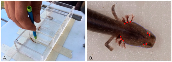 We obtained an initial sample of 800 standardized photographs of wild-caught salamanders from Barton Springs outflows that were suitable for phenotypic analysis (i.e., specimens that did not have obvious head tilt, missing gill insertions, or other apparent abnormalities). The great majority of specimens represented E. sosorum, which is the dominant species at the spring outflows. We added to this dataset any additional wild individuals previously identified as E. waterlooensis (n = 22) as well as individuals of E. waterlooensis from the Austin Salamander Conservation Center (n = 24) in order to increase our sample size and to more accurately evaluate the spectrum of phenotypic variation for this species, which represents only about 1% of the salamanders encountered at Barton Springs [15,20]. The captive E. waterlooensis were mostly large adults, some of which have been maintained in the facility for over a decade, and far exceeded the size of the juveniles that are typically encountered at surface outflows. All salamanders were photographed individually in acrylic chambers with a 5 mm square grid background using a Nikon DSLR and macro lens (Figure 1A). These chambers contained enough spring water to maintain salamanders fully submerged and in a horizontal position for dorsal photographs.