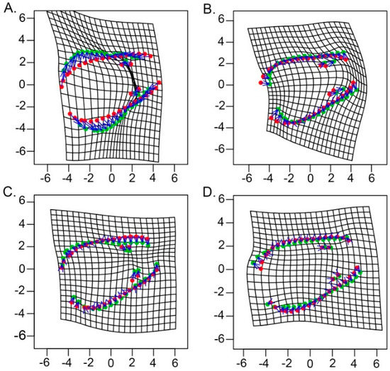Thin plate spline deformation grids of Eurycea waterlooensis showing transformations from low to high principal component (PC) factor scores modeled at two standard deviations below and above the mean value for (A) PC 1; (B) PC 2; (C) PC 3; (D) PC 4.